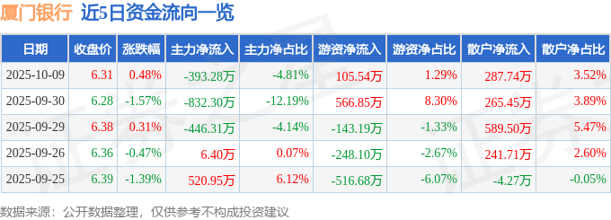 2025-10-12今日股市,股票推荐,大盘走势分析,股市资讯,股票入门,短线炒股/为广大股民提供及时准确的股市行情分析、热点股票推荐、最新利好政策解读与炒股实战经验,帮助你把握投资先机、实现财富增长!证券之星消息,截至2025年10月9日收盘,厦门银行(601187)报收于6.31元,上涨0.48%,换手率1.01%,成交量13.03万手,成交额8174.38万元。