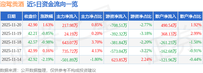 2025-11-22今日股市,股票推荐,大盘走势分析,股市资讯,股票入门,短线炒股/为广大股民提供及时准确的股市行情分析、热点股票推荐、最新利好政策解读与炒股实战经验,帮助你把握投资先机、实现财富增长!证券之星消息,截至2025年11月20日收盘,迎驾贡酒(603198)报收于42.9元,上涨1.63%,换手率0.74%,成交量5.96万手,成交额2.55亿元。