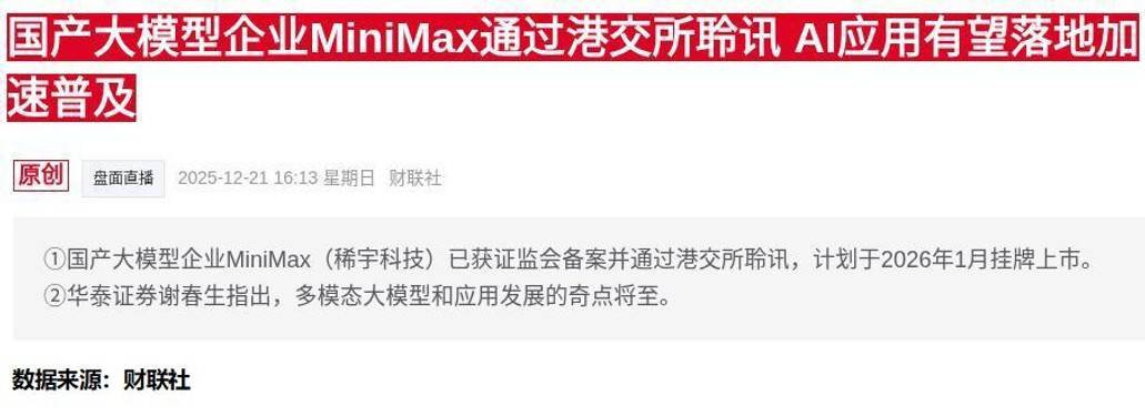 2026-01-01今日股市,股票推荐,大盘走势分析,股市资讯,股票入门,短线炒股/为广大股民提供及时准确的股市行情分析、热点股票推荐、最新利好政策解读与炒股实战经验,帮助你把握投资先机、实现财富增长!最近资本市场最劲爆的消息莫过于国产AI企业MiniMax即将上市。这家成立仅4年的公司,凭借大模型技术已经服务全球200多个国家的2.12亿用户。消息一出,相关概念股应声而动。