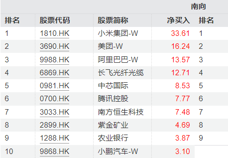 南向资金持续流入港股科技板块:近七日,小米集团-W累计获33.61亿港元的净买入,位居南向资金近7日净买入榜首!美团-W、阿里巴巴-W、中芯国际、腾讯控股、小鹏汽车-W也均位居近7日南向资金净买入榜前十。