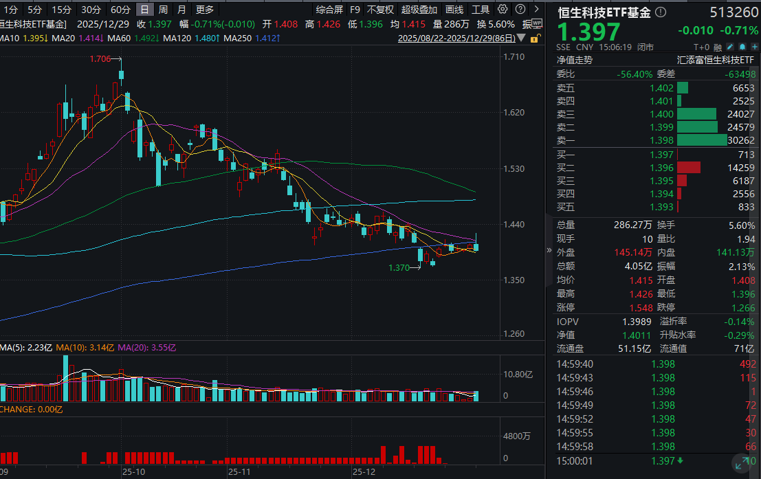 同类唯一15BP最低档管理费的恒生科技ETF基金(513260)收跌0.71%,全天成交额超4亿元。资金面上,近10日有6日获资金青睐,累计净流入超1.4亿元,基金最新融资余额超1.4亿元!