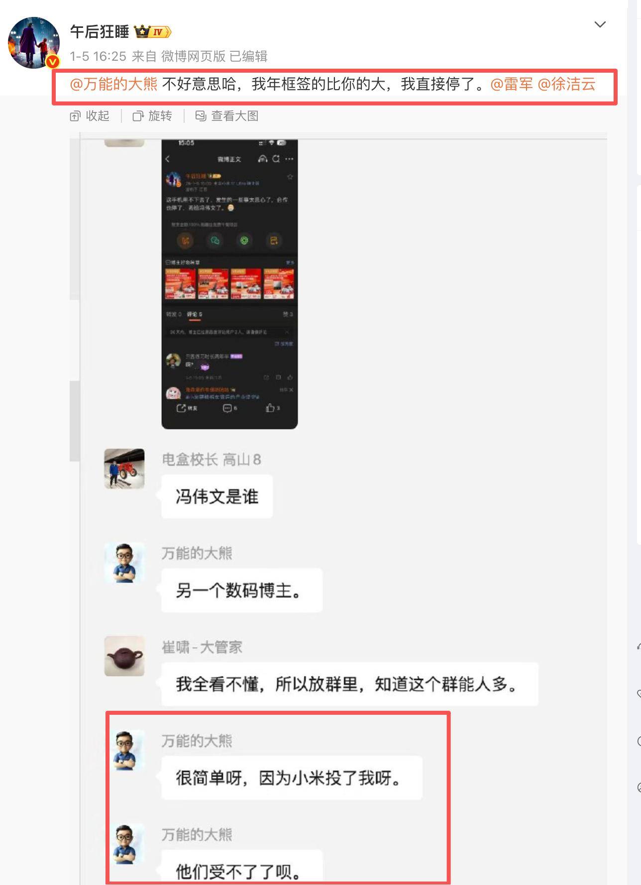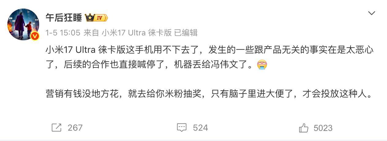 事情是这样的,科技大V午后发微说小米17Ultra用不下去了,原因是对营销的做法不满,随后又丢出截图,点名大熊,说我的年框签的比你大,并且在线艾特了雷军和徐洁云。
