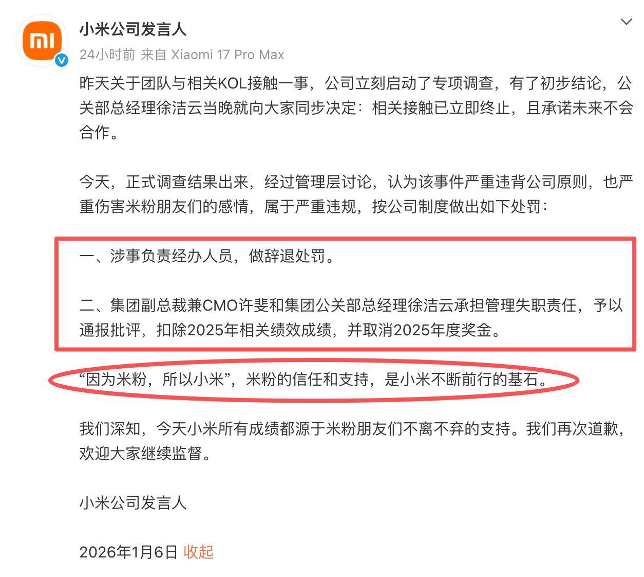 而后,在1月6日小米官方的正式回应来了:①、涉事负责经办人员直接辞退;②、集团副总许斐和公关部总经理徐洁云承担管理失职责任,通报批评,扣除2025年的绩效成绩,并取消年度奖金。