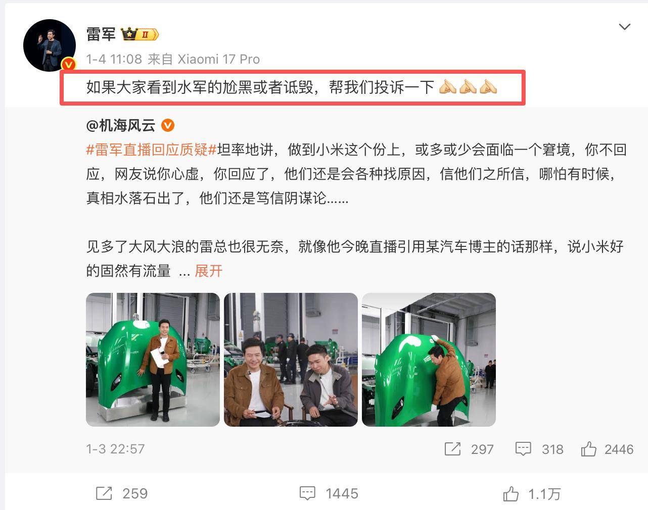 第二天雷军就转发了一个微博,说到“如果大家看到水军的尬黑或者诋毁,帮我们投诉一下”。