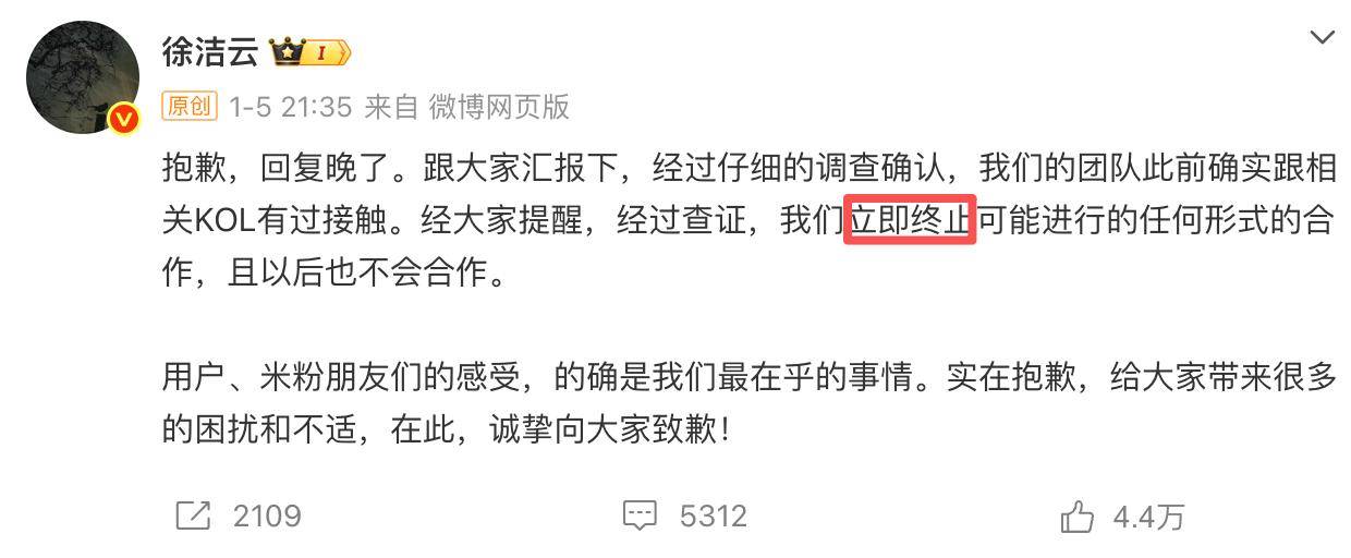 这事儿在各大平台引起反响,直接干热搜了,小米内部肯定也关注到了。在当天晚上,徐洁云终于进行了回复,道歉并立即停止合作,并且表示以后也不会合作。