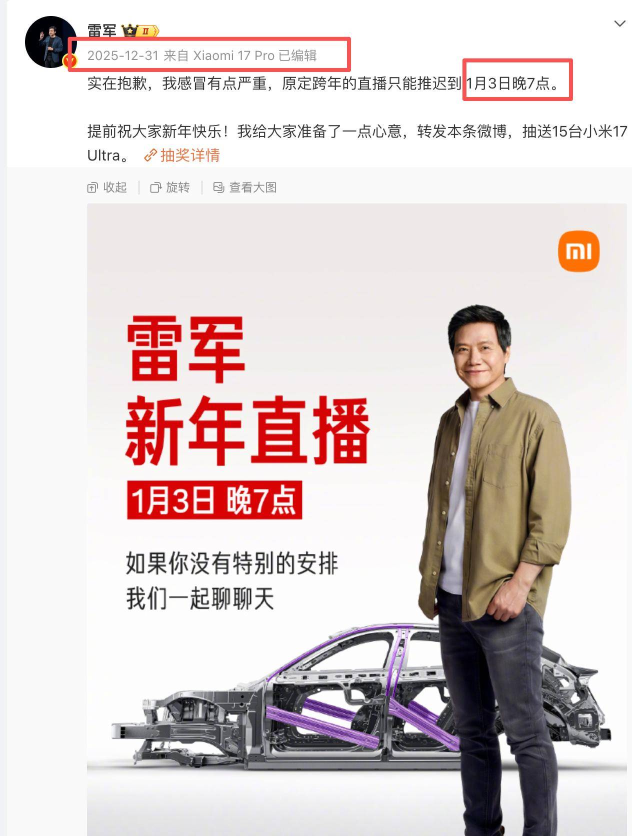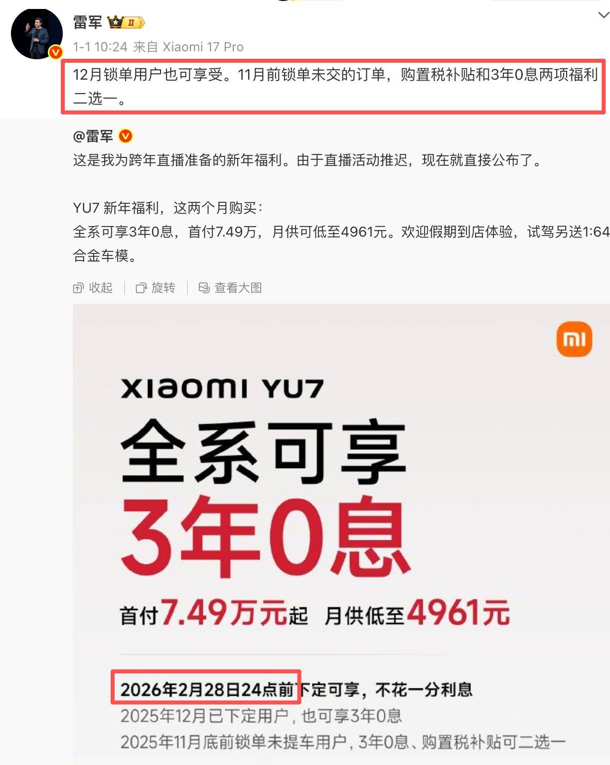 但是第二天一大早雷老板就发微说——因为感冒严重,直播推迟到1月3日晚上了,所以这场拆车直播直到1月3日晚上7点才正式开始。虽然直播延迟了,但是雷军准备的新年福利并没有同步延期,而是准时发布——小米YU7限时【3年0息】,3年0息也算是对友商【5年0息】的跟进,意在降低购车门槛,可以让部分年轻消费者可以通过以相对较低的价格入手YU7。