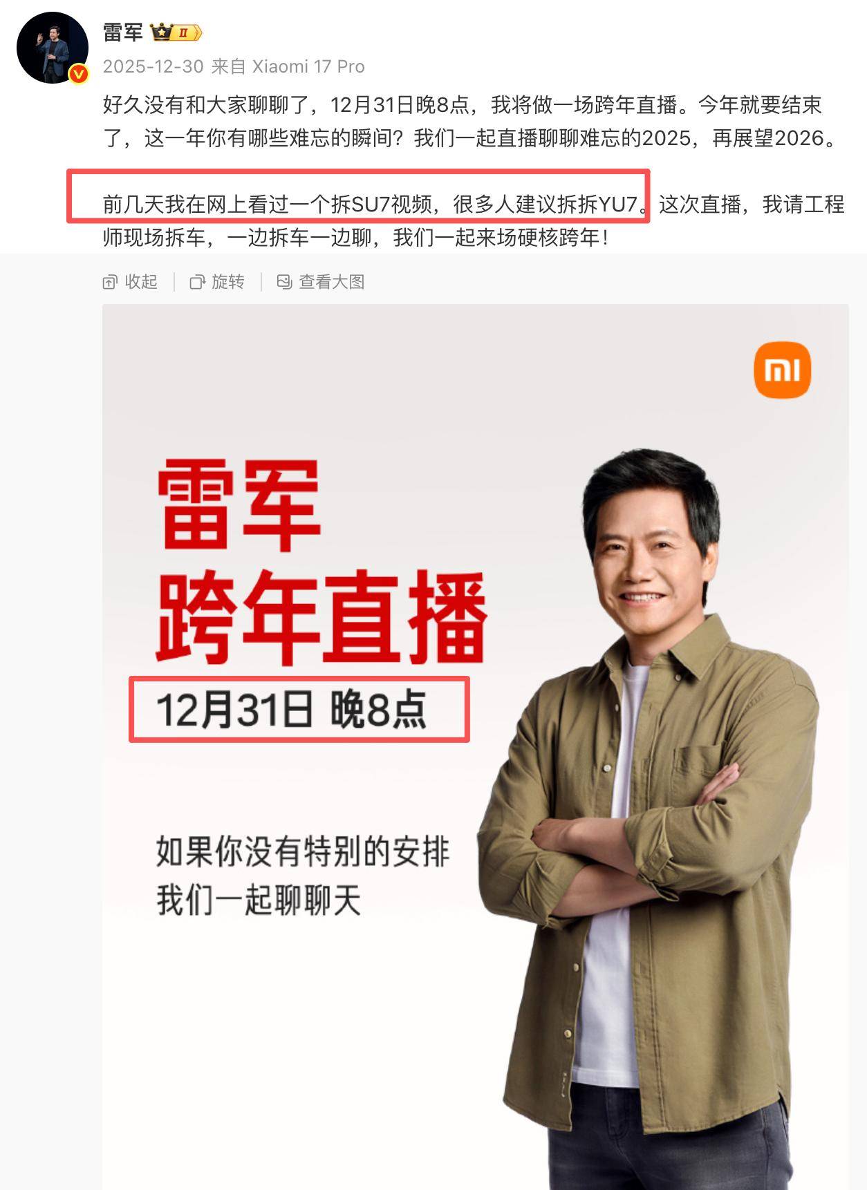 一开始,雷军雷老板是计划做跨年直播的,毕竟跨年这个节点大家都在休息等跨年,很多明星、名人、节目组等都有跨年直播的习惯,雷军有个人的强大IP,再加上米粉数量庞大,千亿总裁开直播拆车陪跨年还是很有吸引力的。