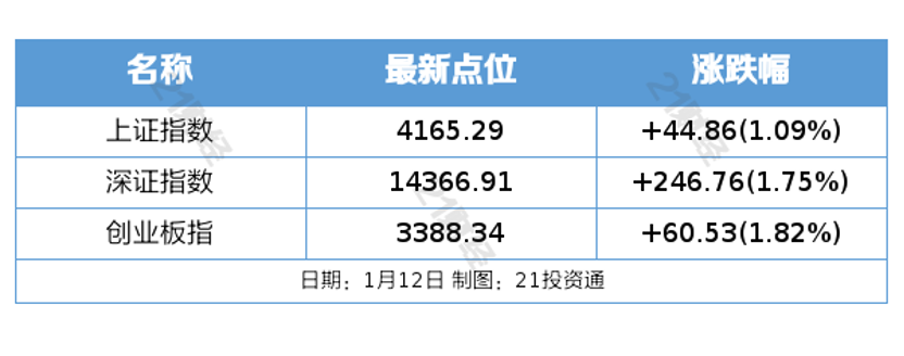 2026-01-13今日股市,股票推荐,大盘走势分析,股市资讯,股票入门,短线炒股/为广大股民提供及时准确的股市行情分析、热点股票推荐、最新利好政策解读与炒股实战经验,帮助你把握投资先机、实现财富增长!1月12日,市场震荡拉升,三大指数均涨超1%,创业板指探底回升,此前一度跌超1%。截至收盘,沪指涨1.09%,深成指涨1.75%,创业板指涨1.82%。沪深两市成交额3.6万亿元,连续第2个交易日突破3万亿元,较上一个交易日放量4787亿元,刷新此前在2024年10月8日创下的成交额历史纪录。