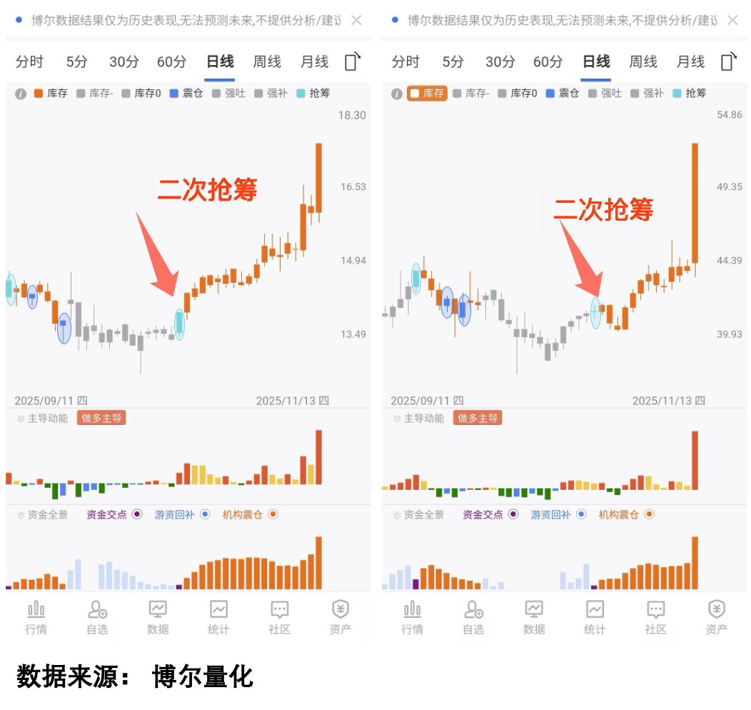 等到调整到一定阶段,又出现了「游资抢筹」现象,这就是「二次抢筹」。因为这次股价在低位,机构不舍得再打压,只能顺势推动走势向上。类似的标的其实并不少,都是先出现「游资抢筹」后遭机构打压,而打压的关键信号就是「机构震仓」,游资看准低位再度进场,最终推动走势向上。看图3: