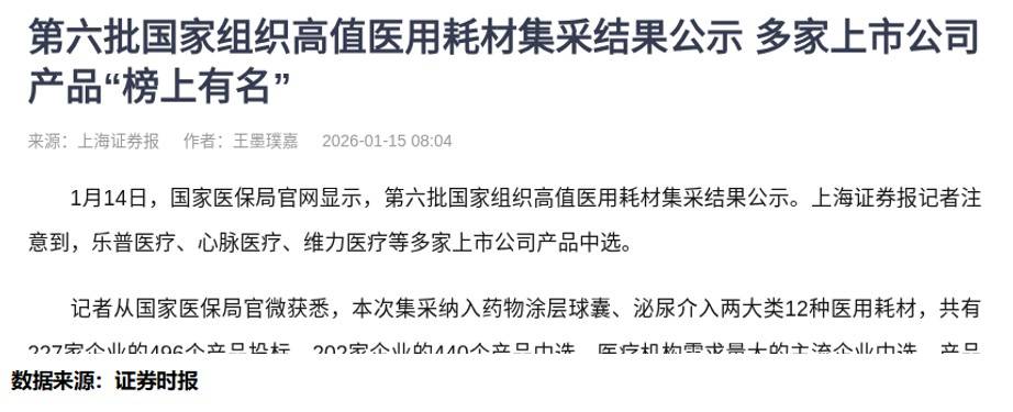 2026-01-19今日股市,股票推荐,大盘走势分析,股市资讯,股票入门,短线炒股/为广大股民提供及时准确的股市行情分析、热点股票推荐、最新利好政策解读与炒股实战经验,帮助你把握投资先机、实现财富增长!最近看到医保局公示了第六批高值医用耗材集采结果,这次覆盖了药物涂层球囊、泌尿介入两大类12种耗材,好多上市公司的产品都成功中选。算上这次,已经累计开展六批国家组织高值医用耗材集采,覆盖9大类142种,涉及心内科、骨科、眼科等多个主要临床领域。再过几个月,患者就能用上这些中选产品,既能减轻费用负担,临床使用的匹配度也挺高,连有特殊功能的耗材都有企业中选,能满足不同的临床需求。