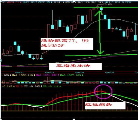 当30分钟图77,99线走平上翘,股价上涨了一定幅度后,又下跌到77,99线线线必须保持上翘,这时可极积介入。(最好介入是,当MACD的绿柱一根比一根短时或红柱刚刚加长时)
