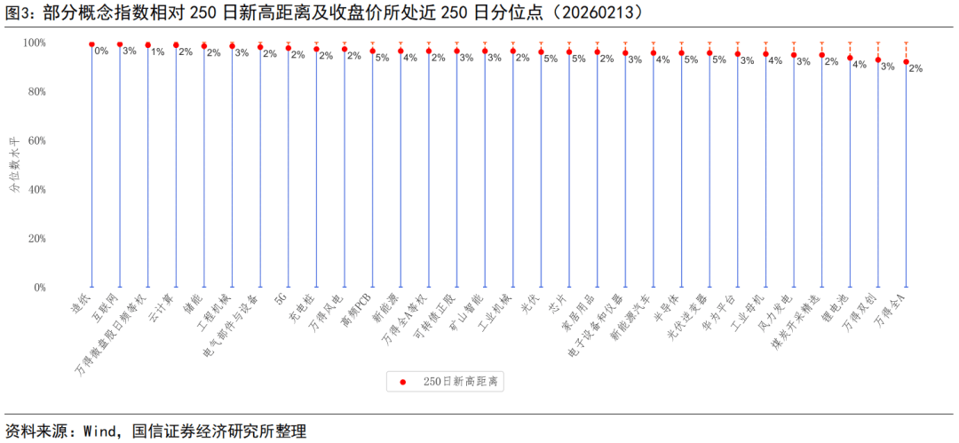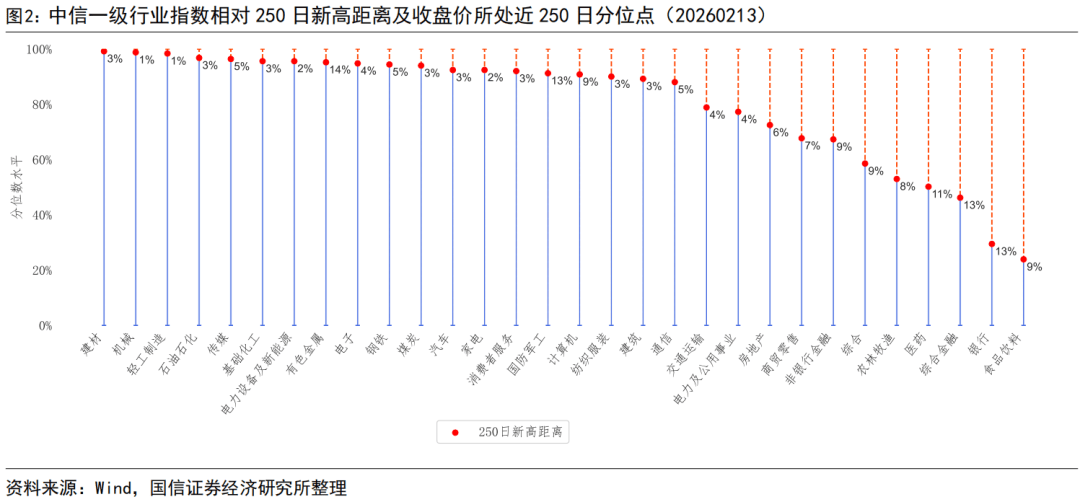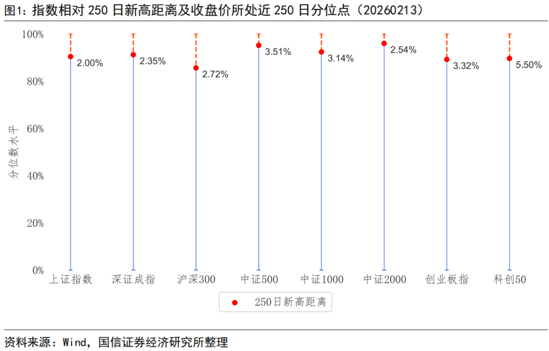 截至2026年2月13日,上证指数、深证成指、沪深300、中证500、中证1000、中证2000、创业板指、科创50指数250日新高距离分别为2.00%、2.35%、2.72%、3.51%、3.14%、2.54%、3.32%、5.50%。中信一级行业指数中建材、机械、轻工制造、石油石化、传媒行业指数距离250日新高较近,食品饮料、银行、综合金融、医药、农林牧渔行业指数距离250日新高较远。概念指数中,造纸、互联网、万得微盘股日频等权、云计算、储能、工程机械、电气部件与设备等概念指数距离250日新高较近。