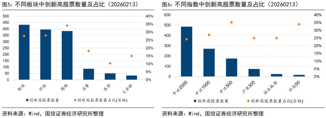 截至2026年2月13日,共1390只股票在过去20个交易日间创出250日新高。其中创新高个股数量最多的是机械、电子、基础化工行业,创新高个股数量占比最高的是有色金属、石油石化、钢铁行业。按照板块分布来看,本周制造、科技板块创新高股票数量最多;按照指数分布来看,中证2000、中证1000、中证500、沪深300、创业板指、科创50指数中创新高个股数量占指数成份股个数比例分别为:24.30%、27.10%、35.20%、25.00%、25.00%、34.00%。