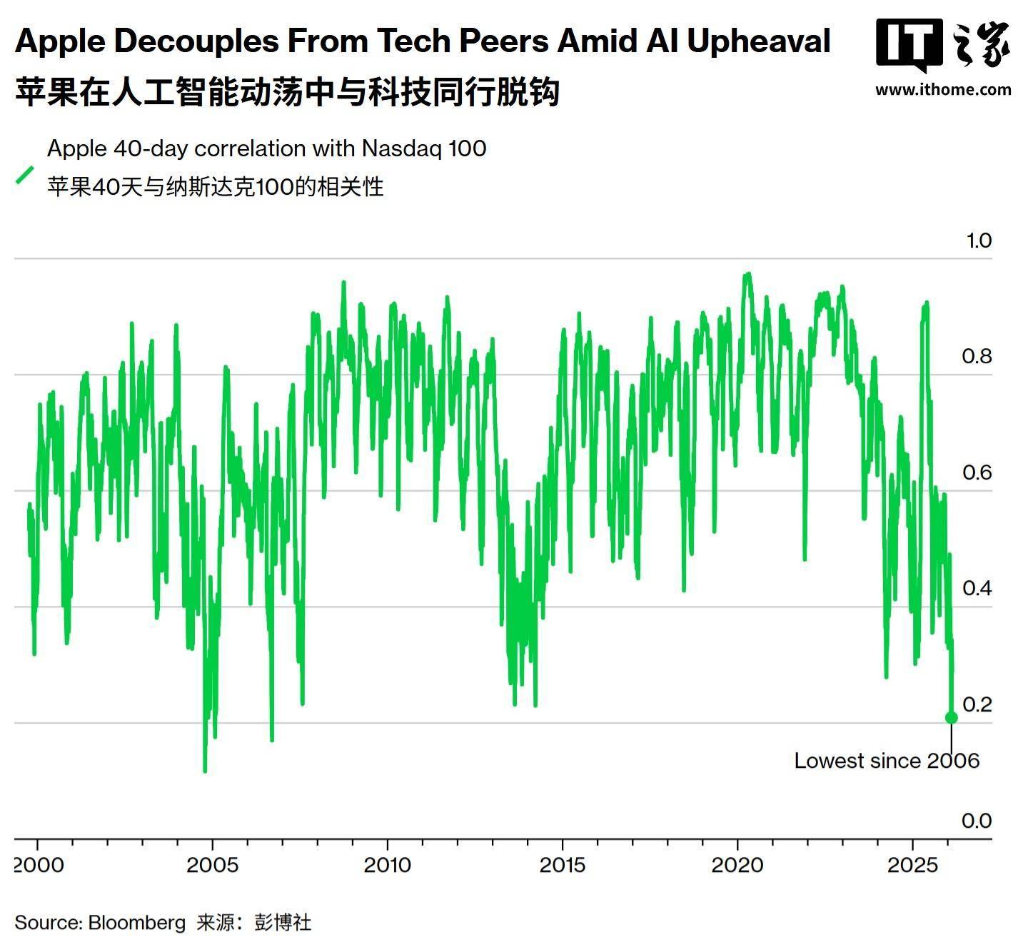 IT之家援引博文介绍,苹果恰好处于这两个焦虑点的盲区,该公司既未参与疯狂的资本支出竞赛,也没有核心业务面临被 Claude 等 AI 工具取代的风险。这种“置身事外”的策略,让苹果在科技股的剧烈波动中成为了一种稀缺的替代性投资选项。