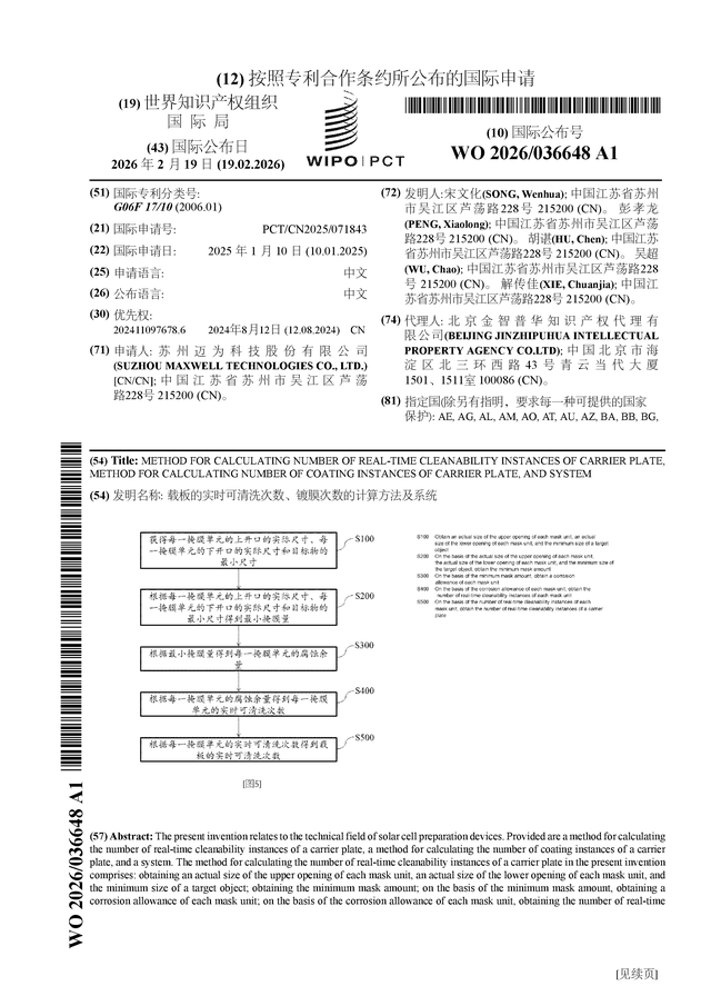 2026-02-23今日股市,股票推荐,大盘走势分析,股市资讯,股票入门,短线炒股/为广大股民提供及时准确的股市行情分析、热点股票推荐、最新利好政策解读与炒股实战经验,帮助你把握投资先机、实现财富增长!证券之星消息,根据企查查数据显示迈为股份(300751)公布了一项国际专利申请,专利名为“载板的实时可清洗次数、镀膜次数的计算方法及系统”,专利申请号为PCT/CN2025/071843,国际公布日为2026年2月19日。