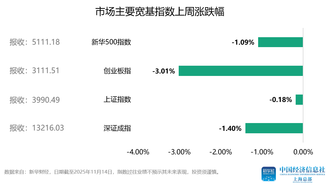 2025-11-18今日股市,股票推荐,大盘走势分析,股市资讯,股票入门,短线炒股/为广大股民提供及时准确的股市行情分析、热点股票推荐、最新利好政策解读与炒股实战经验,帮助你把握投资先机、实现财富增长!本周(11月10日至11月14日)A股市场主要宽基指数悉数回调。其中,上证指数周度下跌0.18%;深证成指周度下跌1.40%;创业板指周度下跌3.01%;新华500指数周度下跌1.09%。